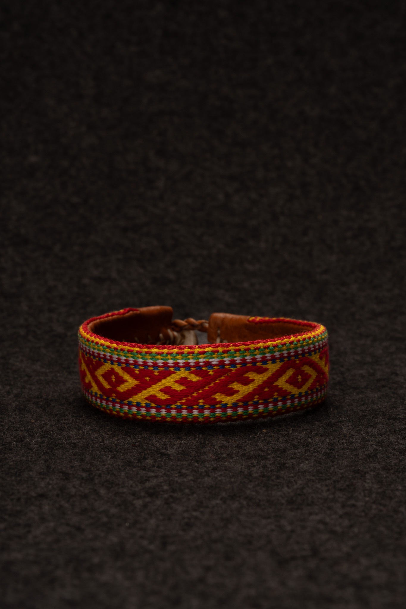 Armband med maskinvävt band och insida i renskinn av Katarina Bergdahl. Stl: 19 cm.