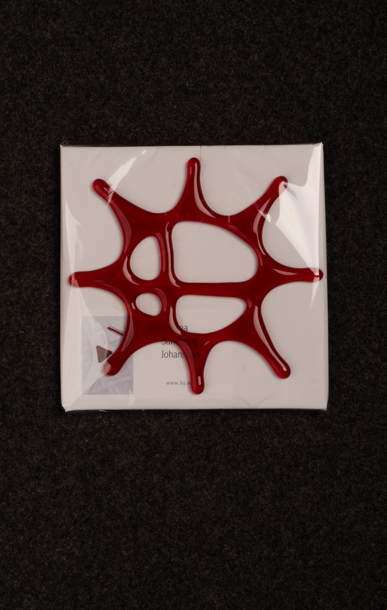 Fönsterhänge Biejvve/Sol, i en lite mindre storlek i rött, av Lena Sandberg Johansson.