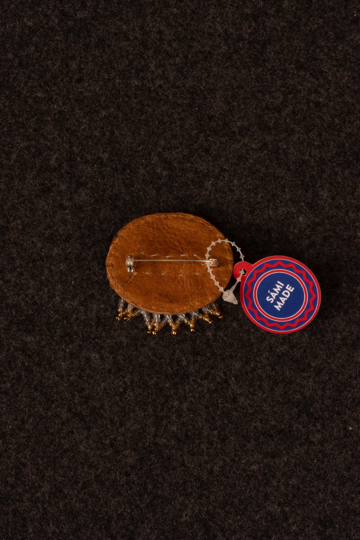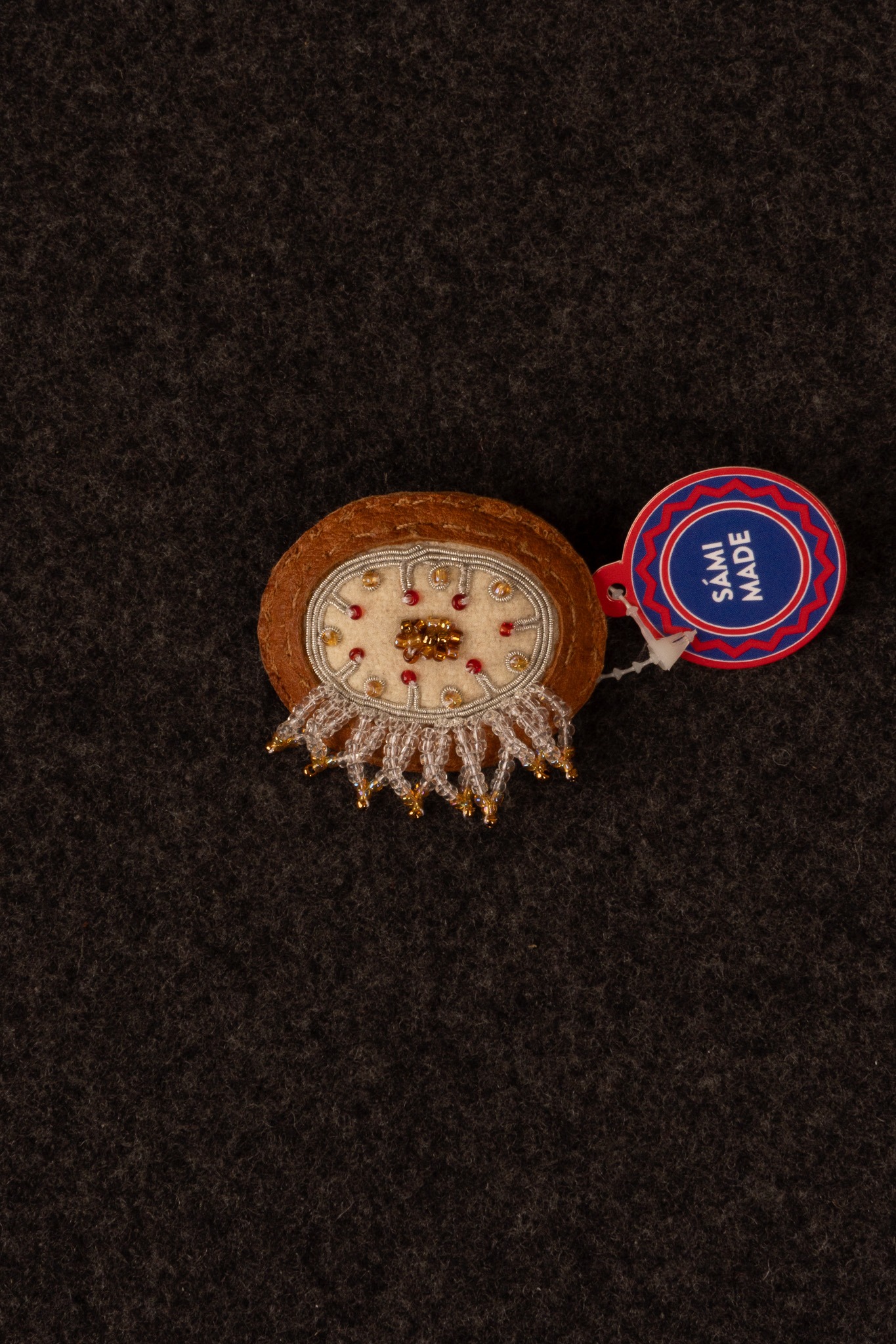 Brosch av renskinn och kläde med tennbroderi och glaspärlor av Susanne Långberg Winka.