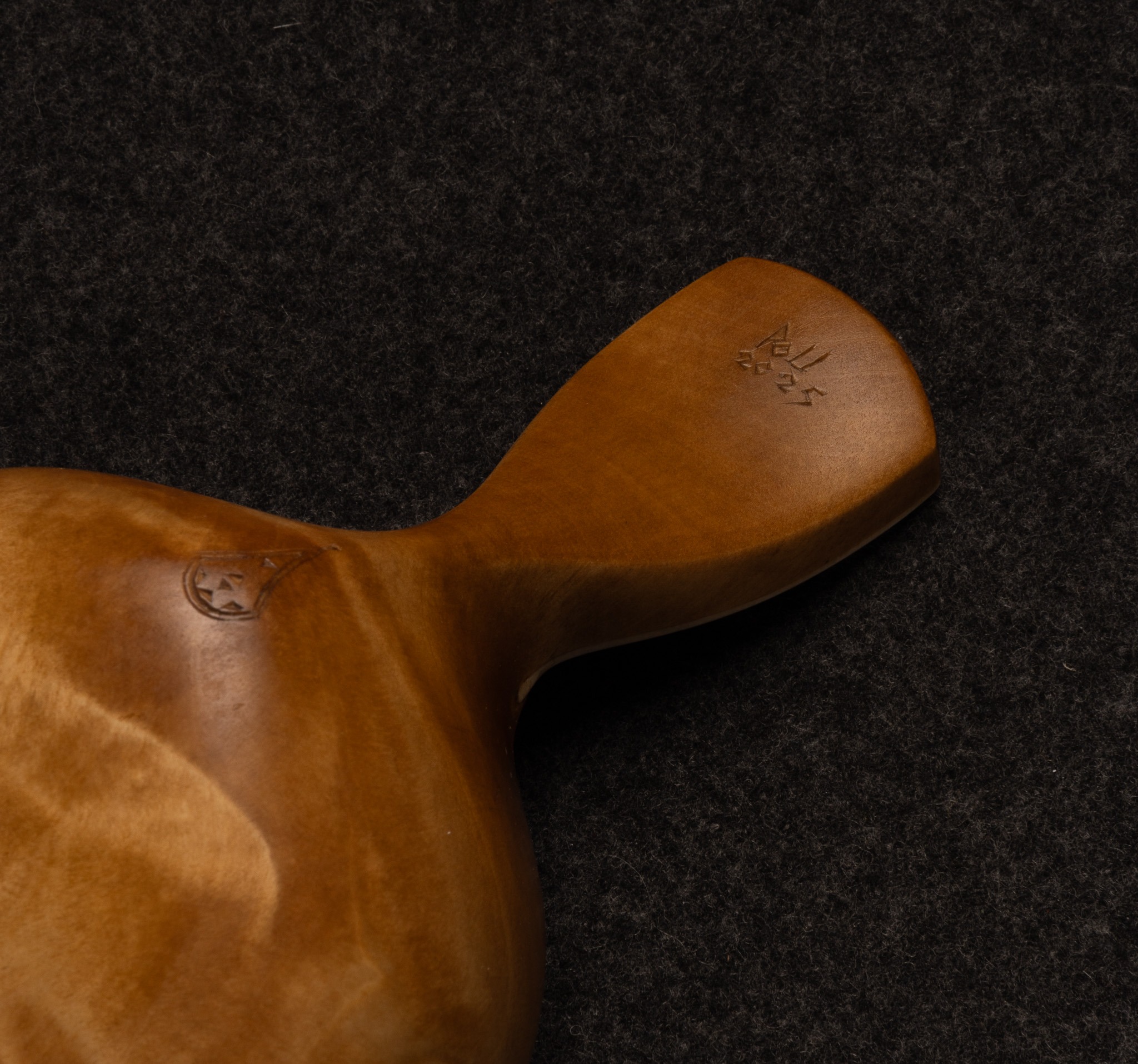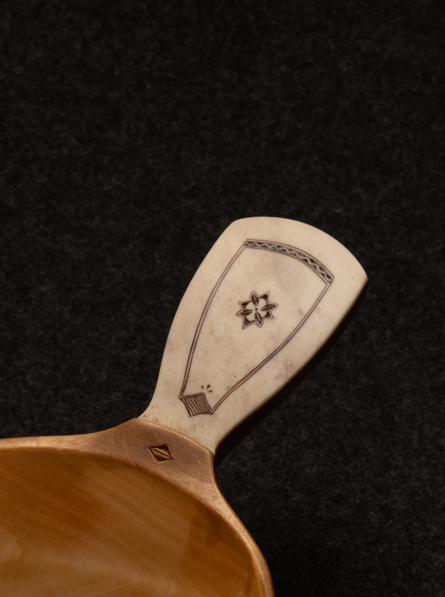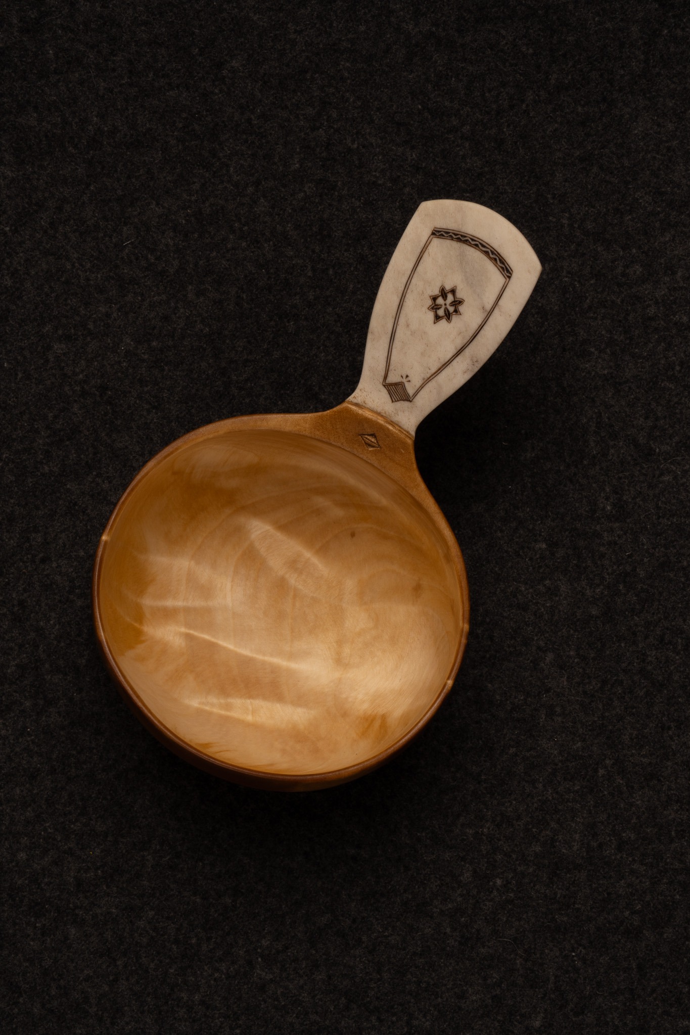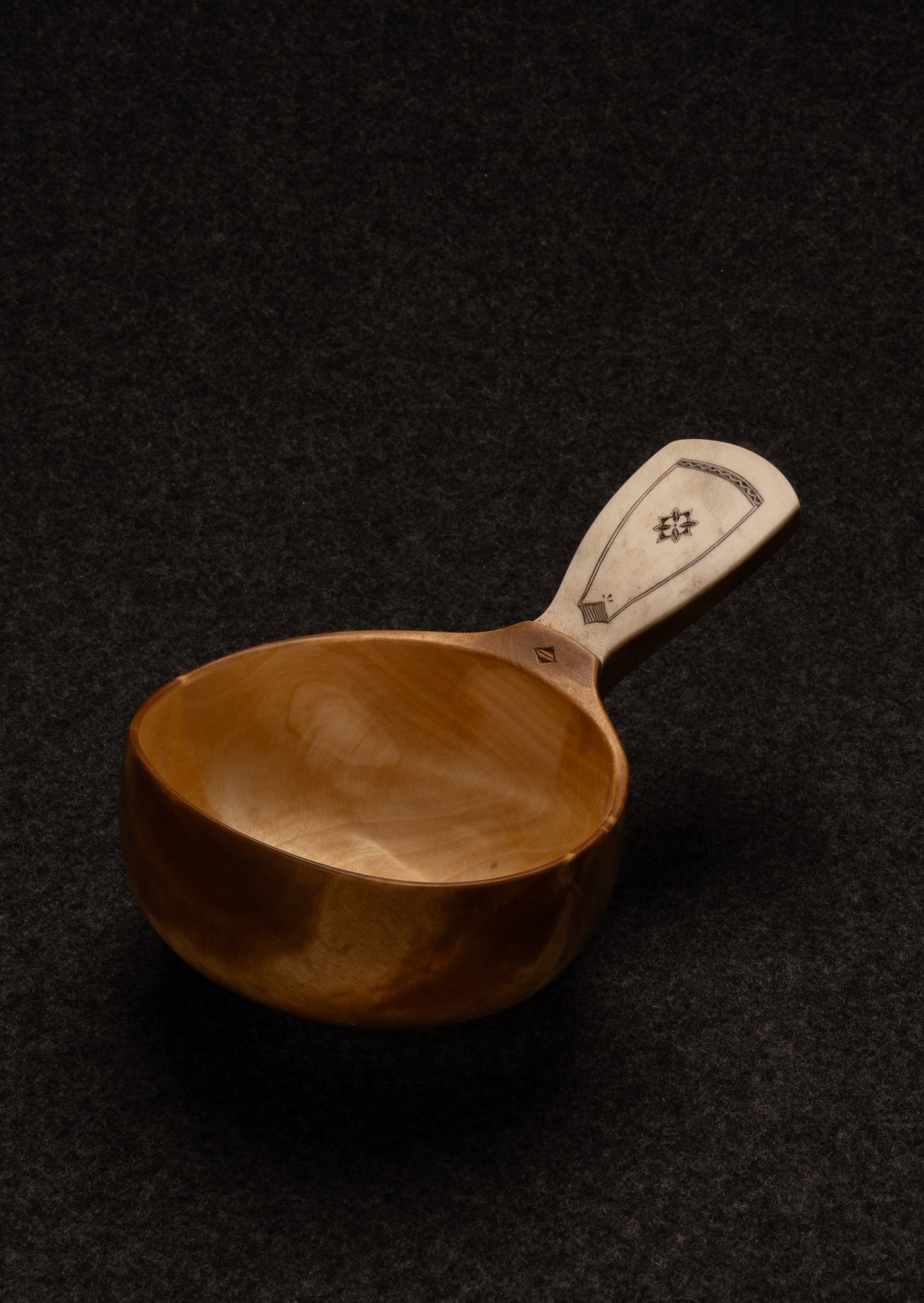 Guksi/kosa av björkvril. Horninlägg med gravyr av Per-Ola Utsi. Rymmer: 2 dl.