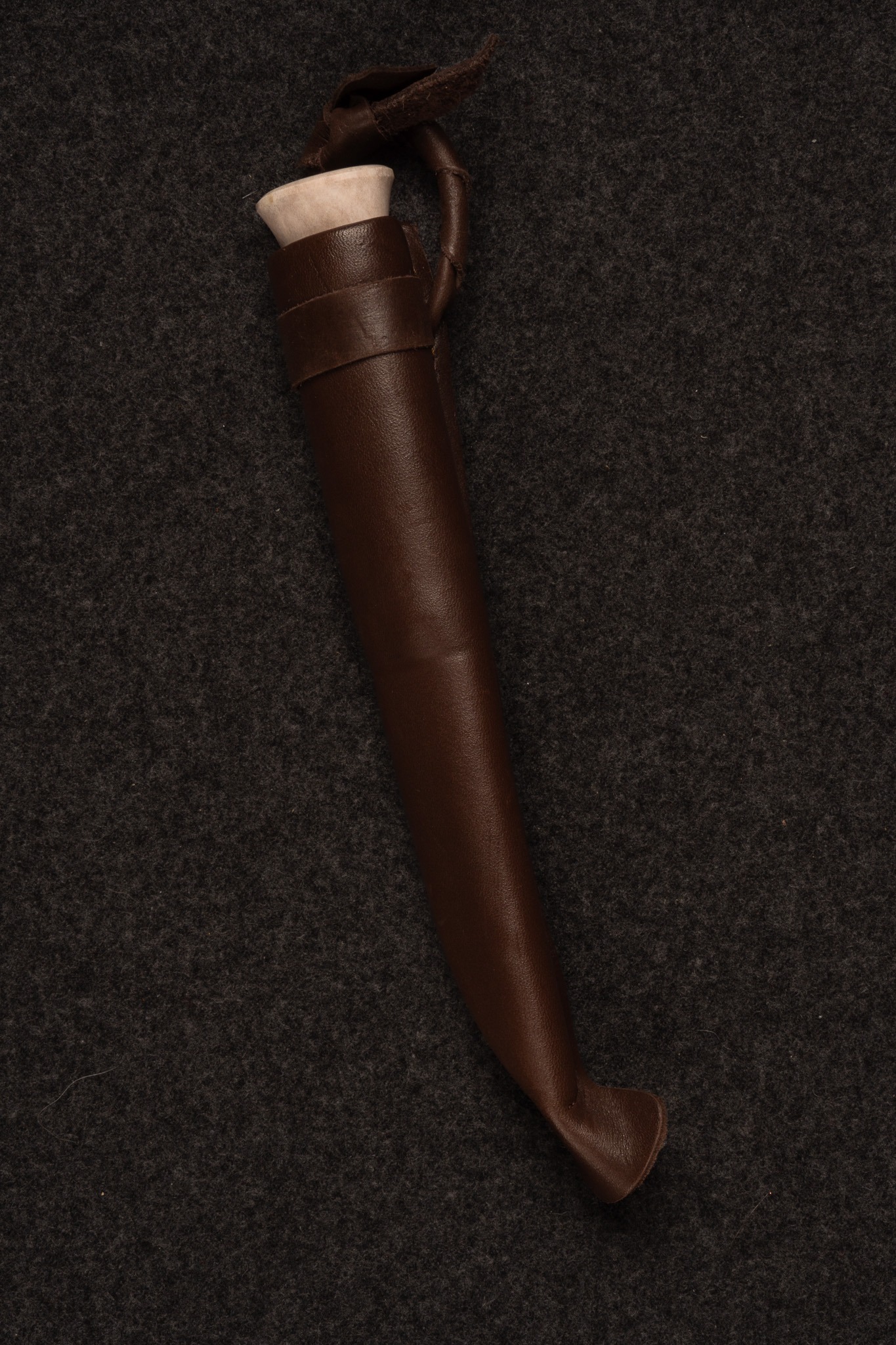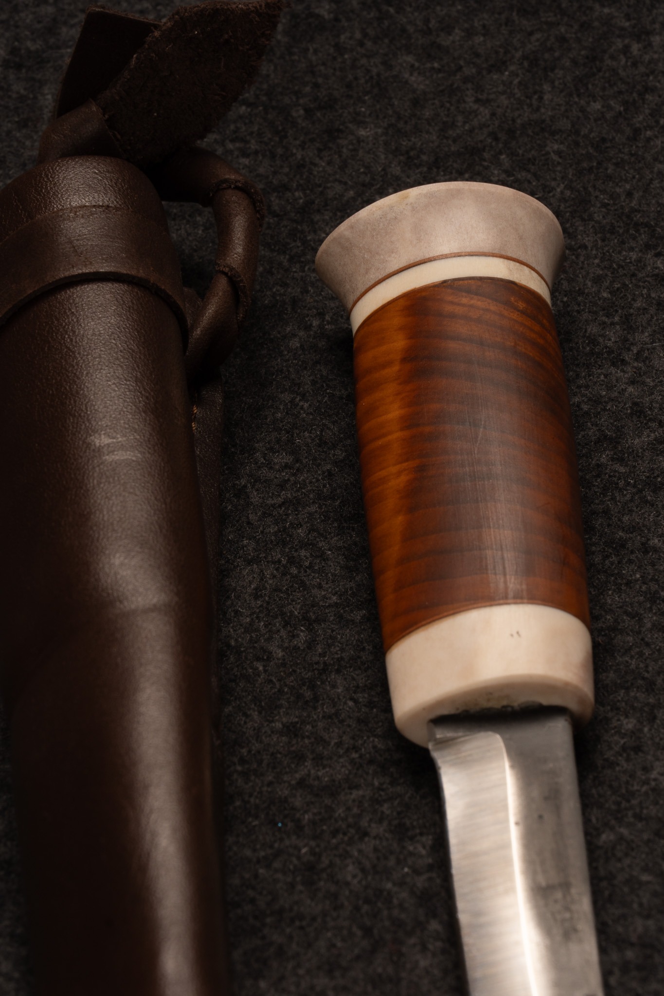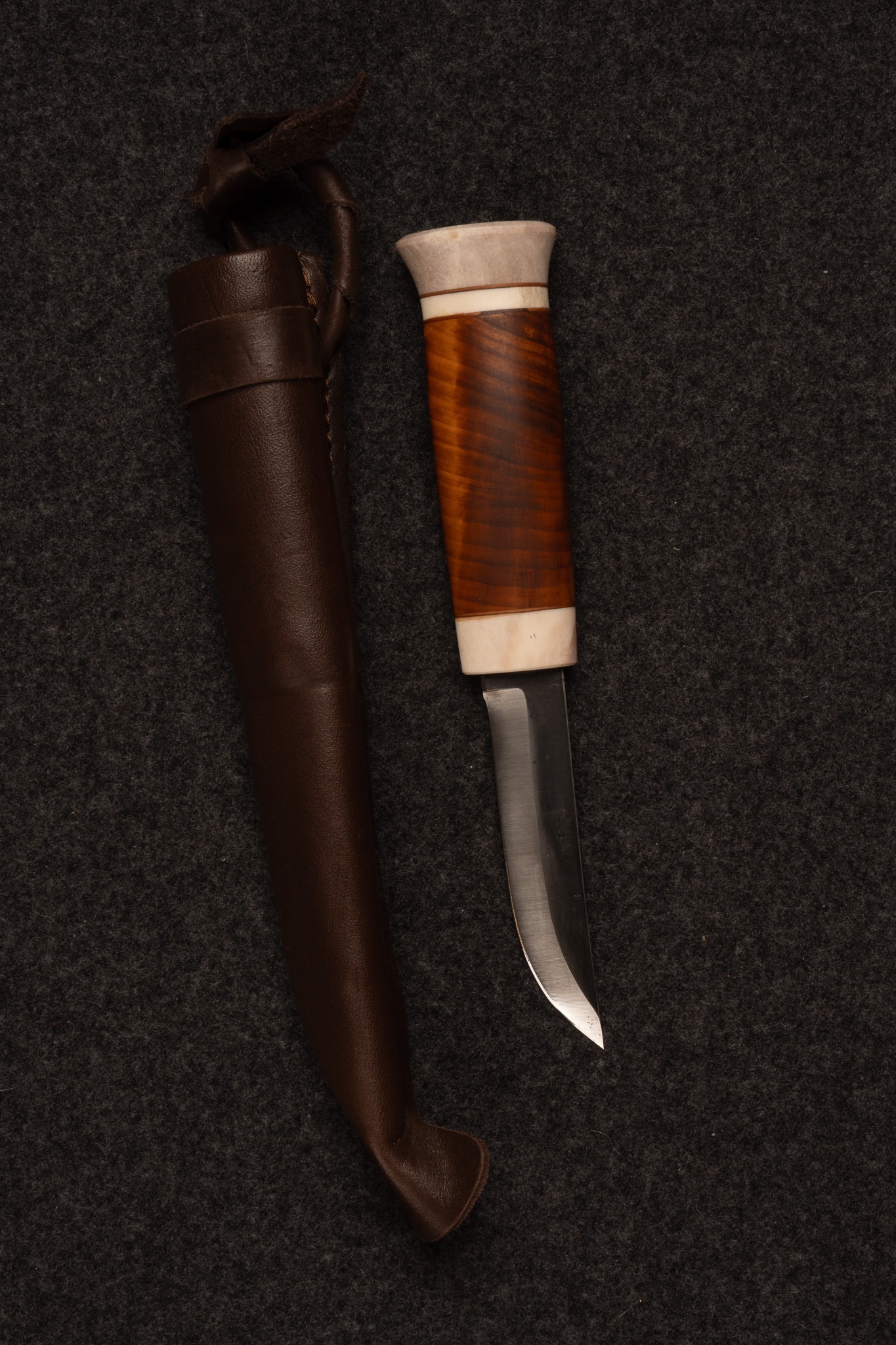 Kniv med läderslida och inre bladskydd. Handtag i masurbjörk och renhorn av familj Jon Tomas Utsi.
