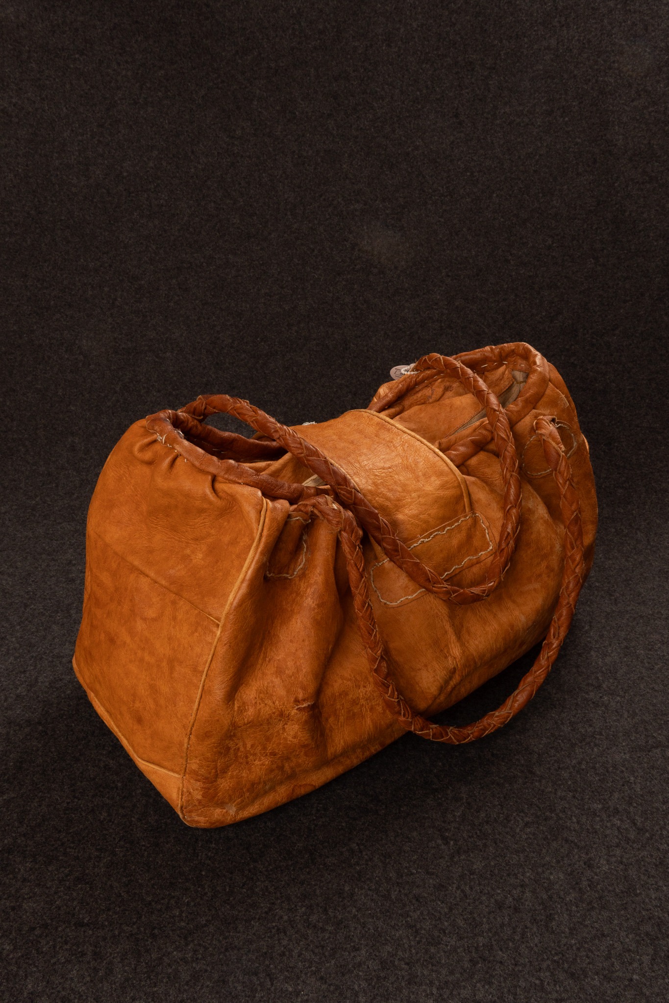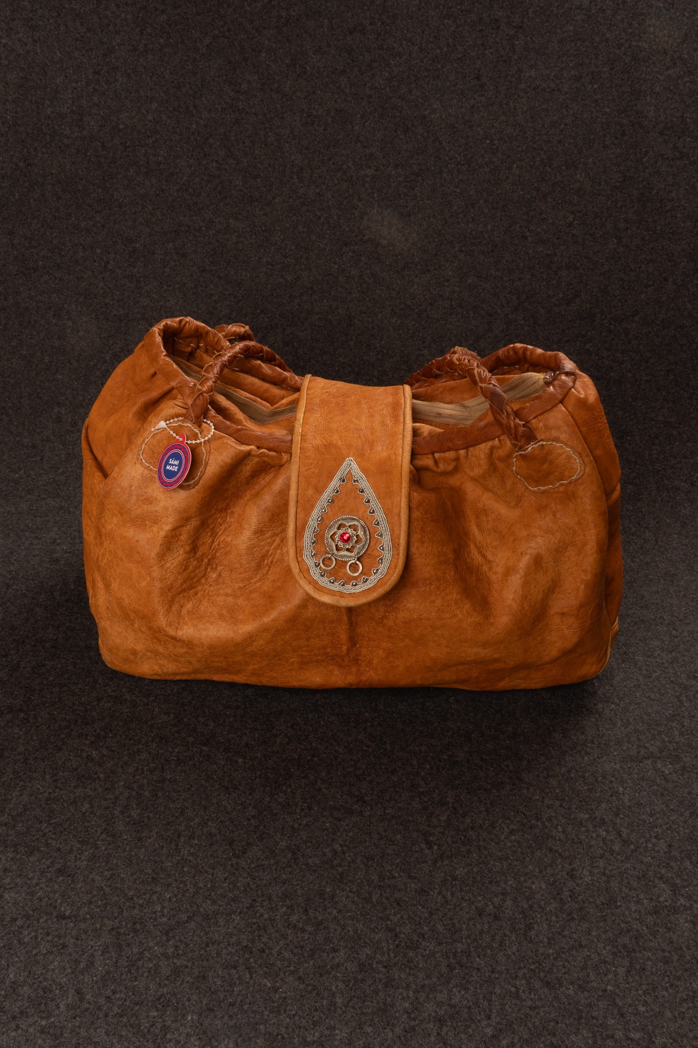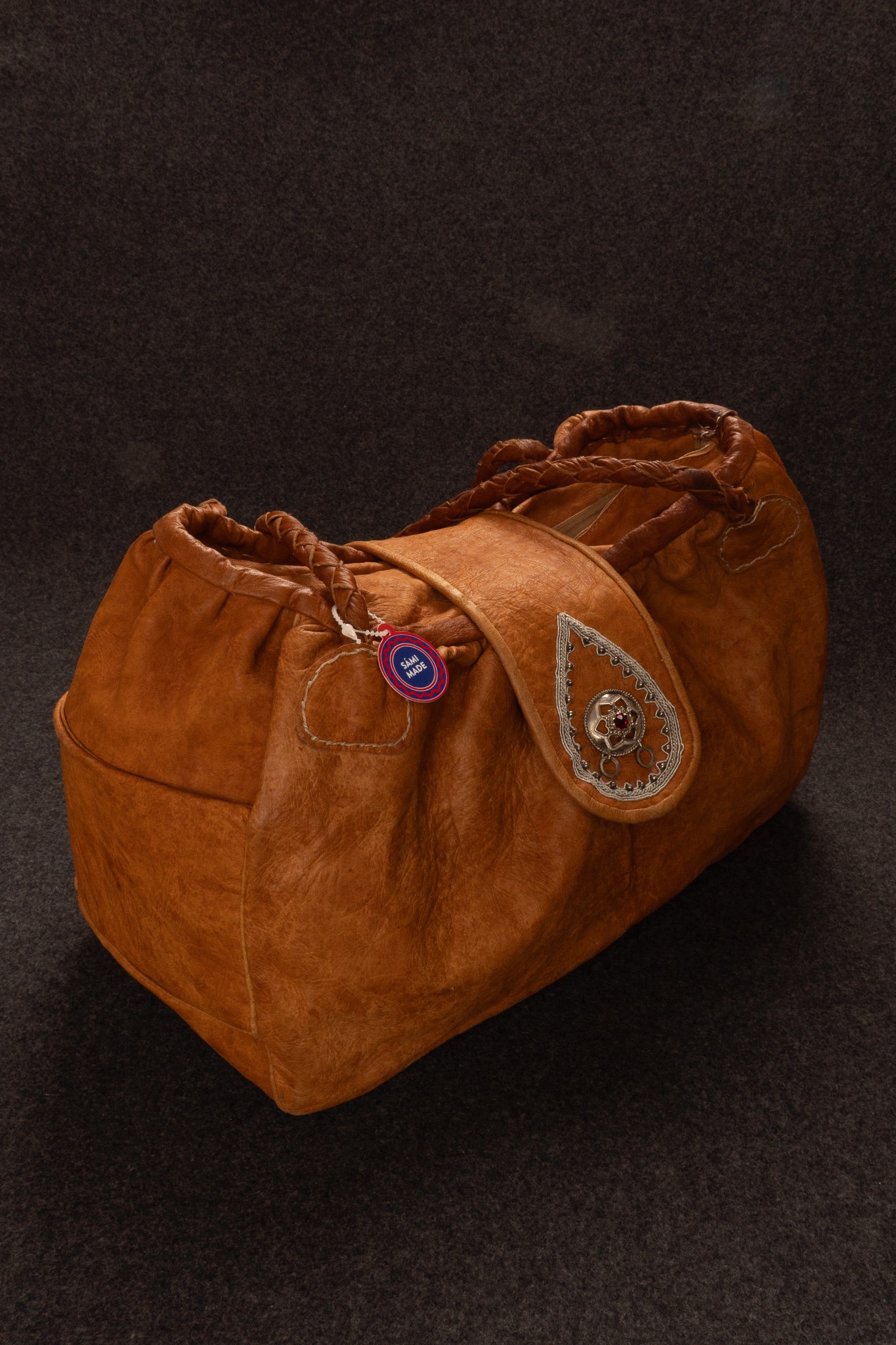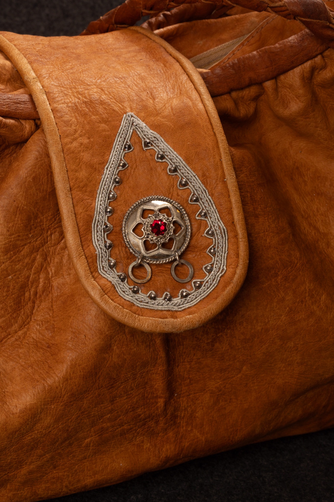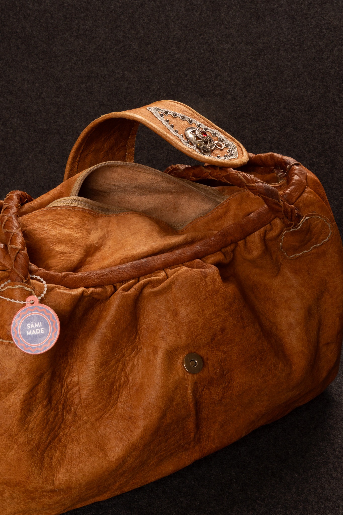 Större handväska i renskinn med dekoration av tenntråd, pärlor och en silverknapp med röd glassten av Susanne Långberg Winka.