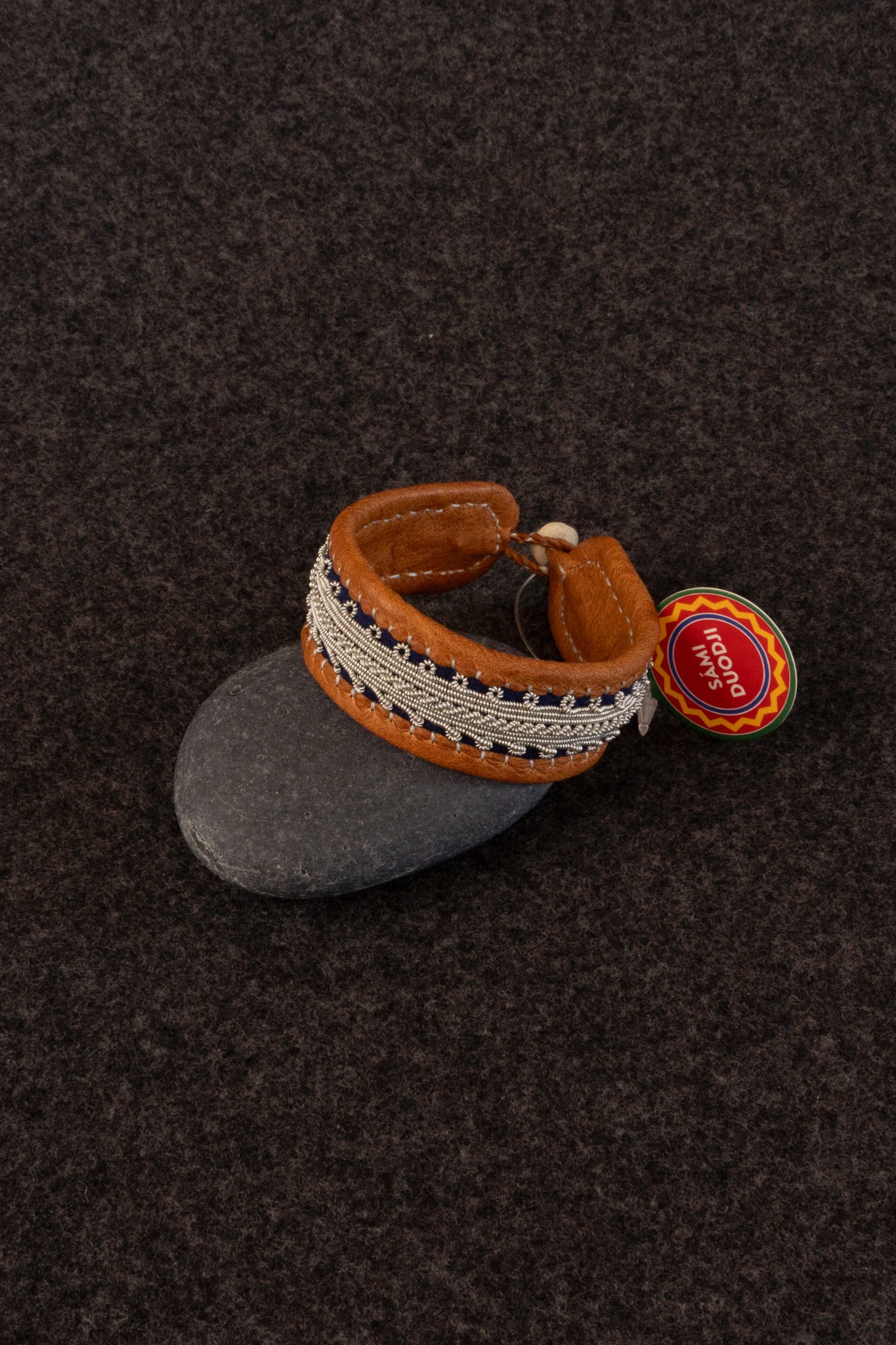 Tennbroderat armband på mörkblå klädesbotten av Katarina Bergdahl.
