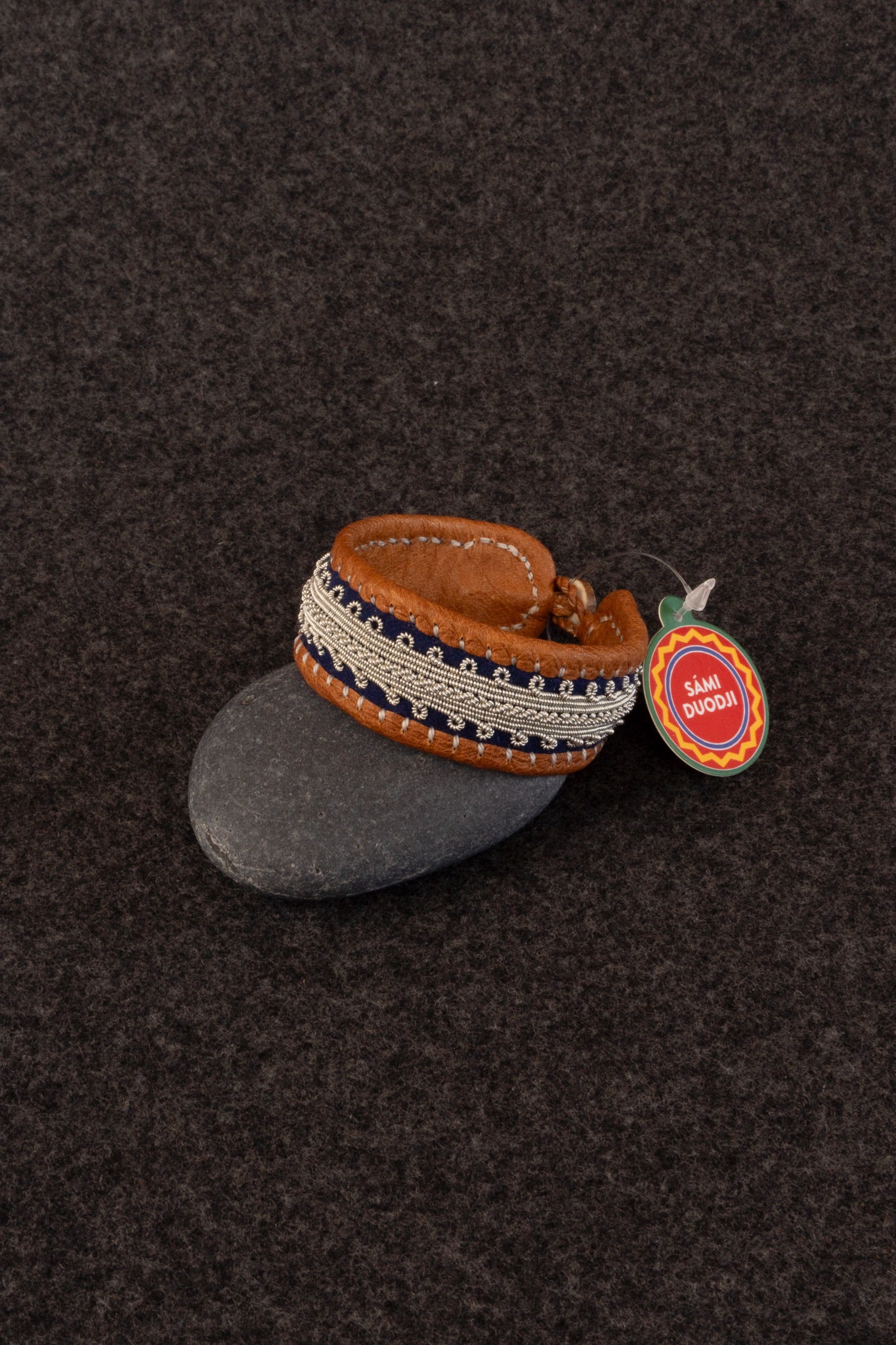 Tennbroderat armband på mörkblå klädesbotten av Katarina Bergdahl.