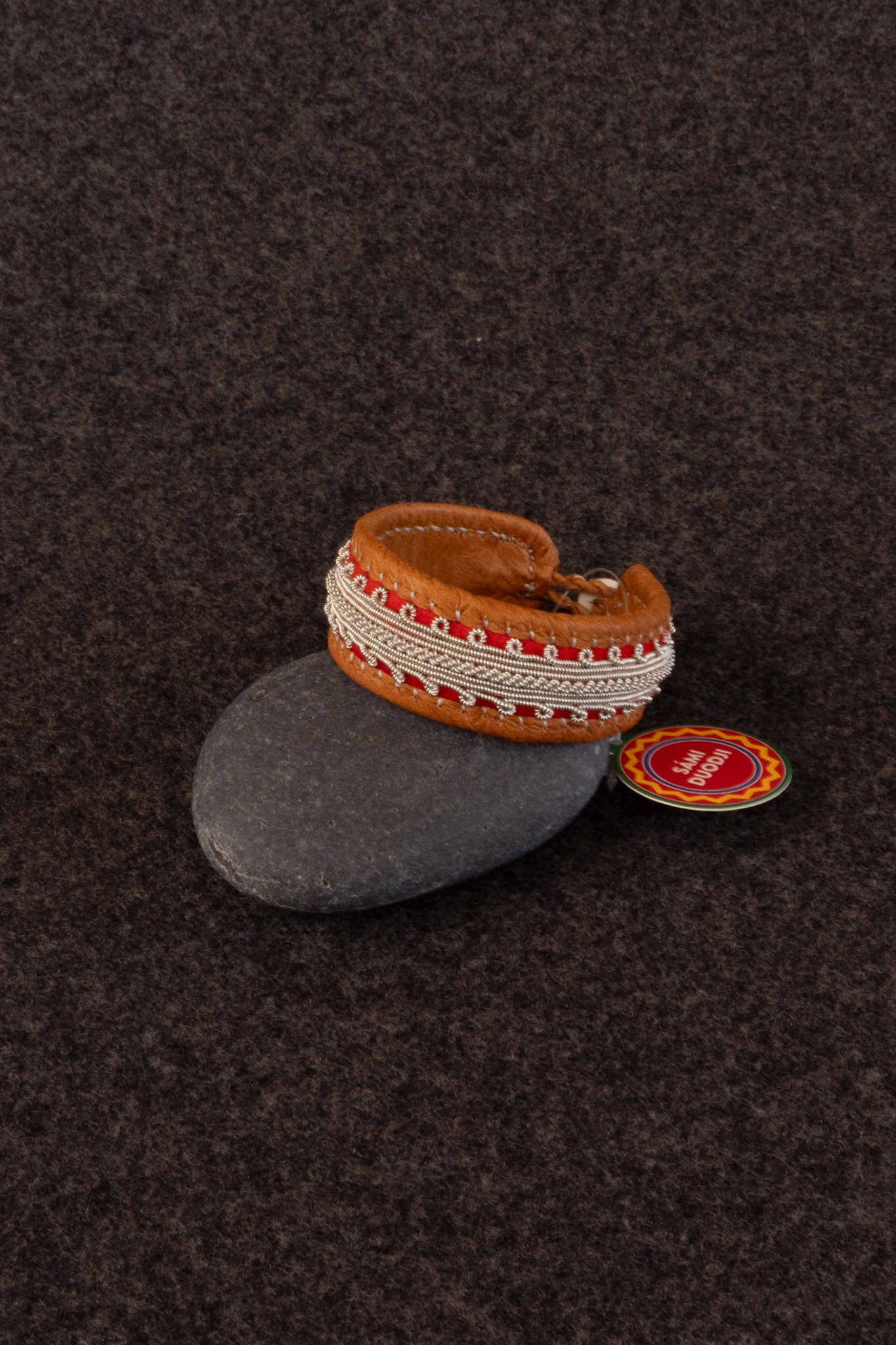 Tennbroderat armband på röd klädesbotten av Katarina Bergdahl.