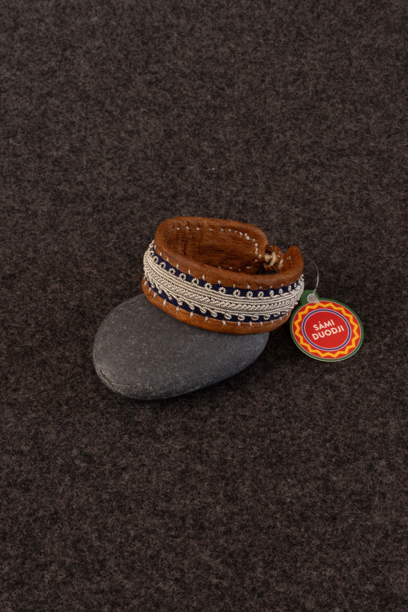 Tennbroderat armband på mörkblå klädesbotten av Katarina Bergdahl.