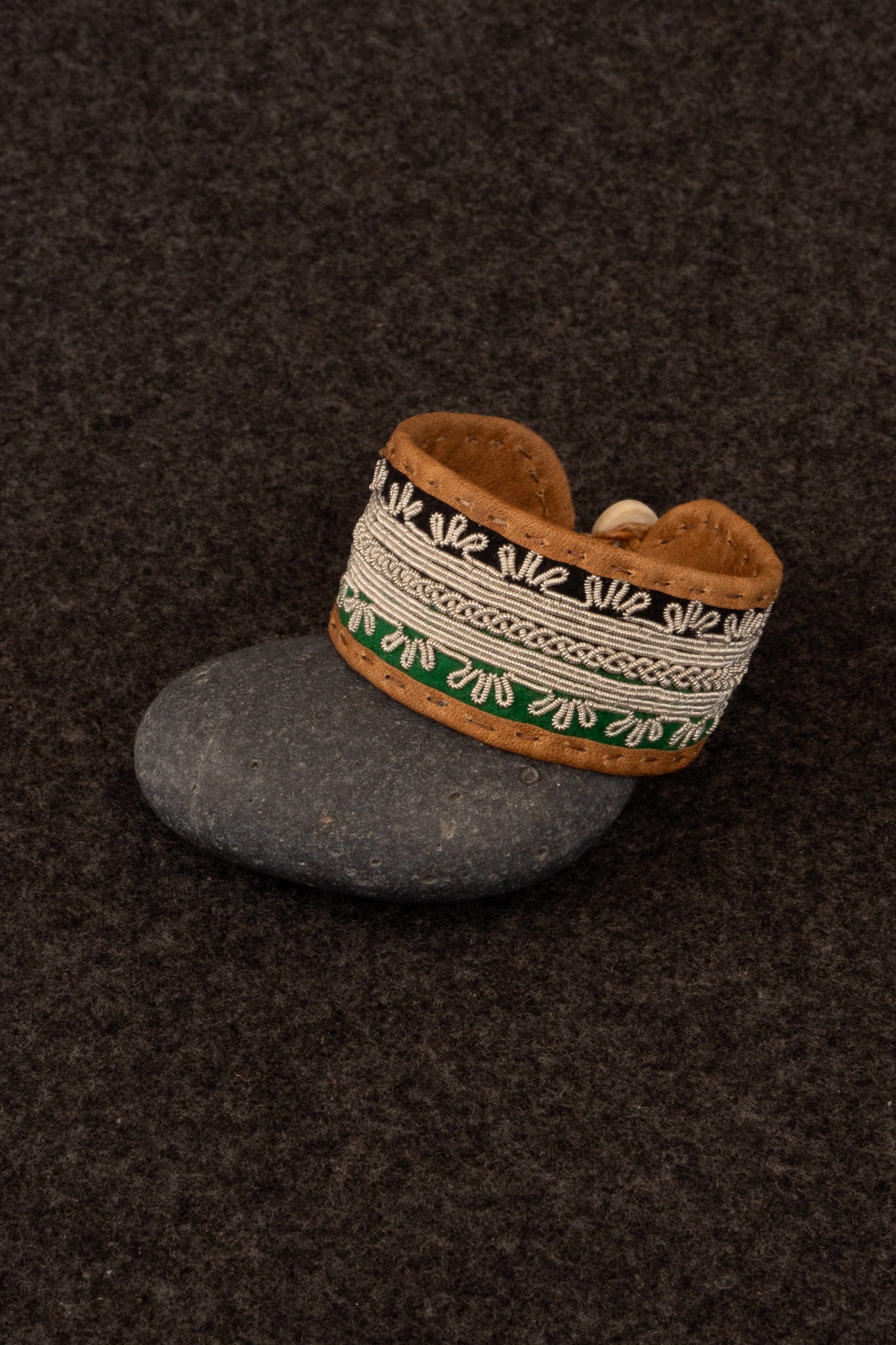 Tennbroderat armband med renskinn och svart och grönt kläde, av Ann Skum Lindström.