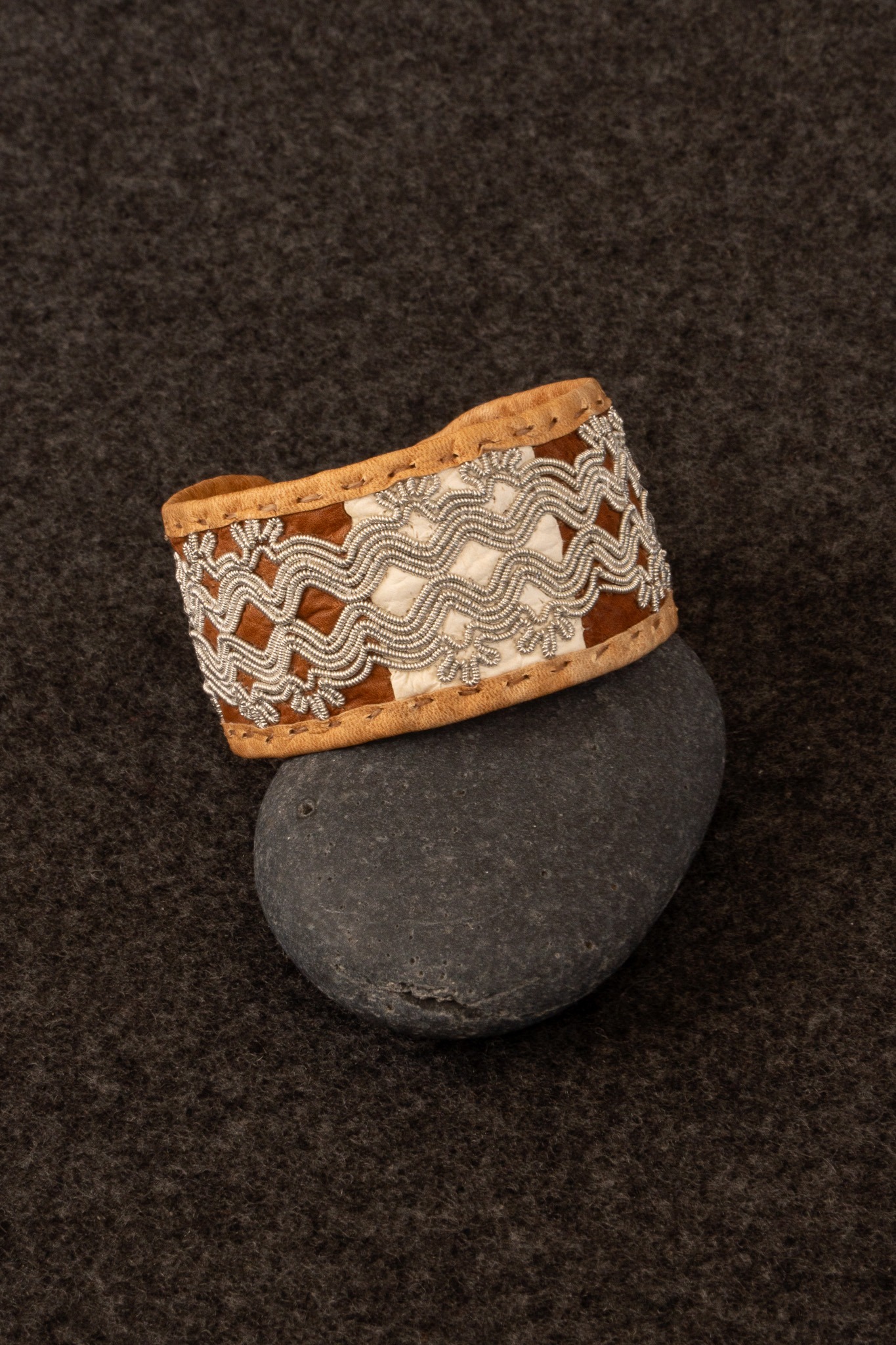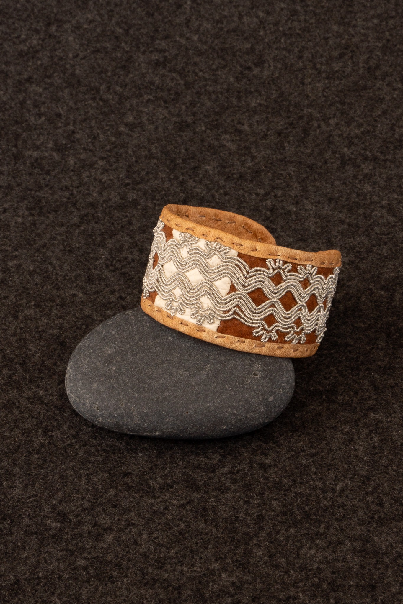 Tennbroderat armband med vitt och brunt renskinn, av Ann Skum Lindström.