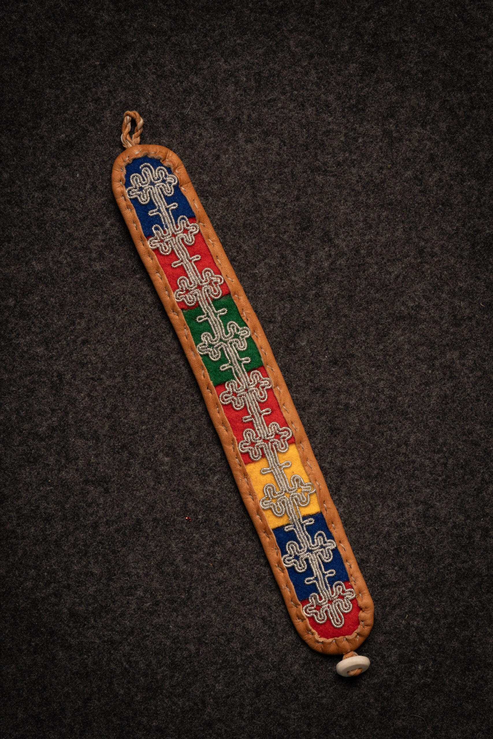Armband i renskinn med tennbroderi på kläde av Ann Skum Lindström. Storlek 19,6 cm.