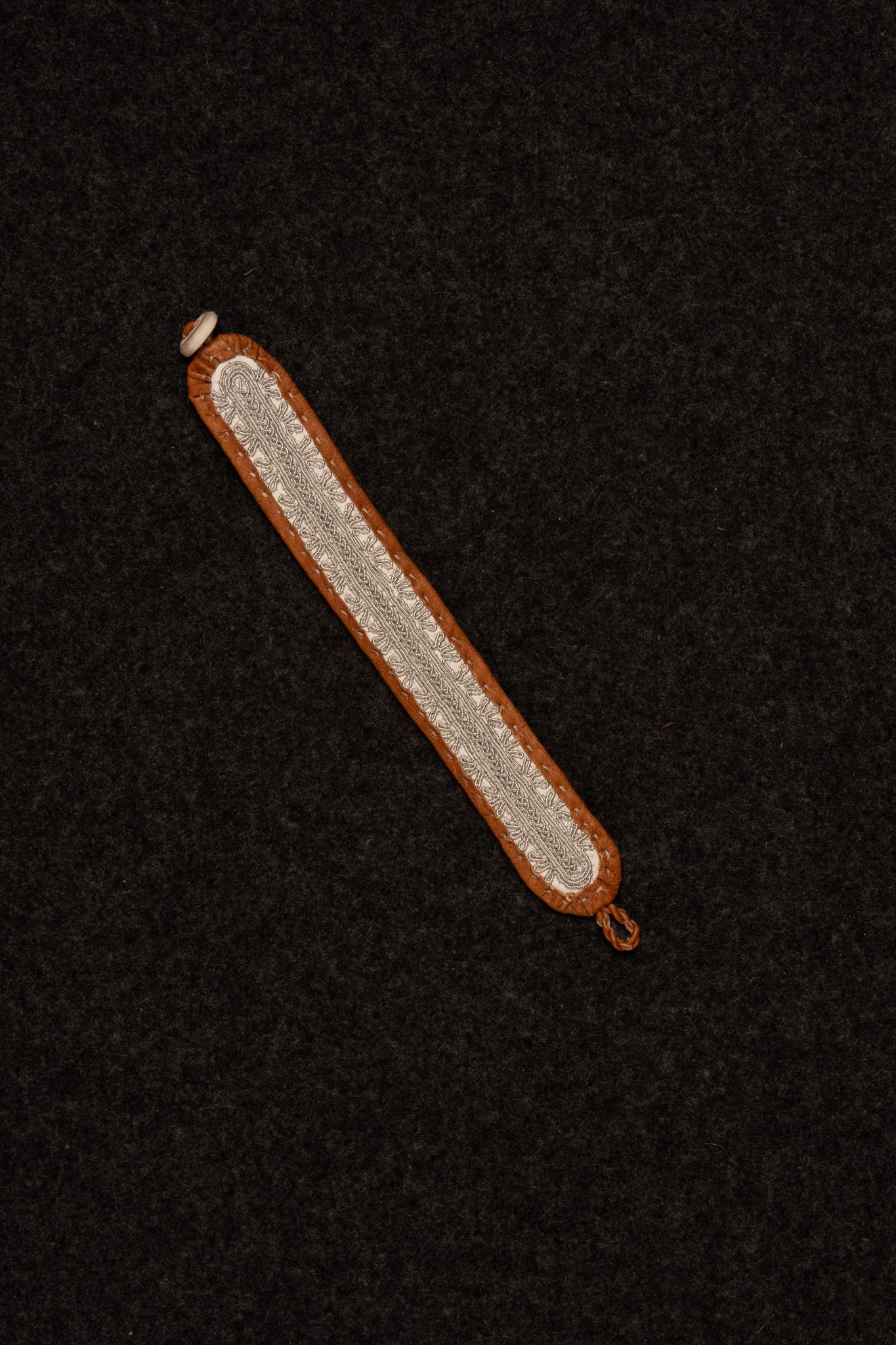 Armband i renskinn med tennbroderi på kläde av Ann Skum Lindström. Storlek 16,5 cm.