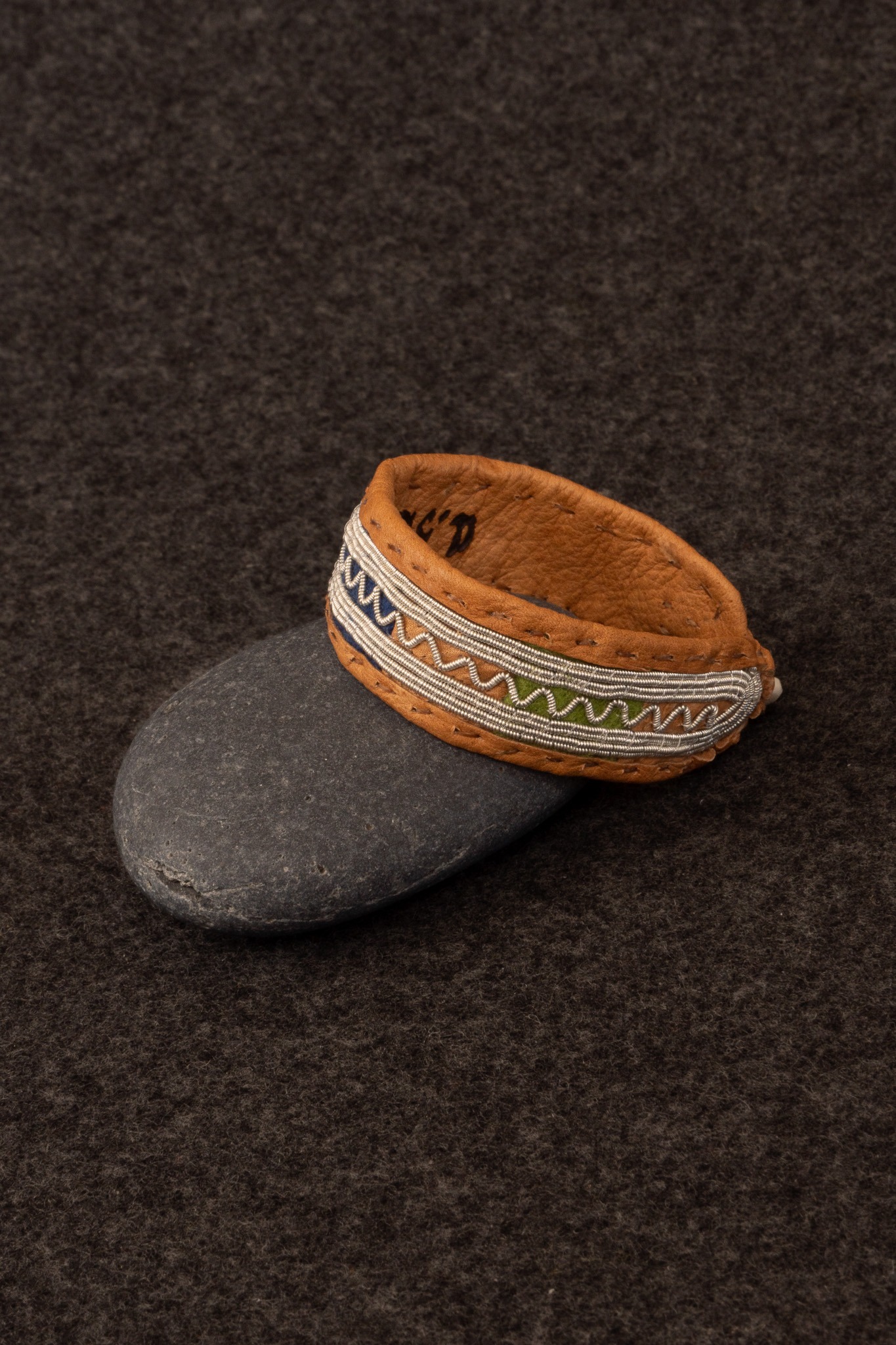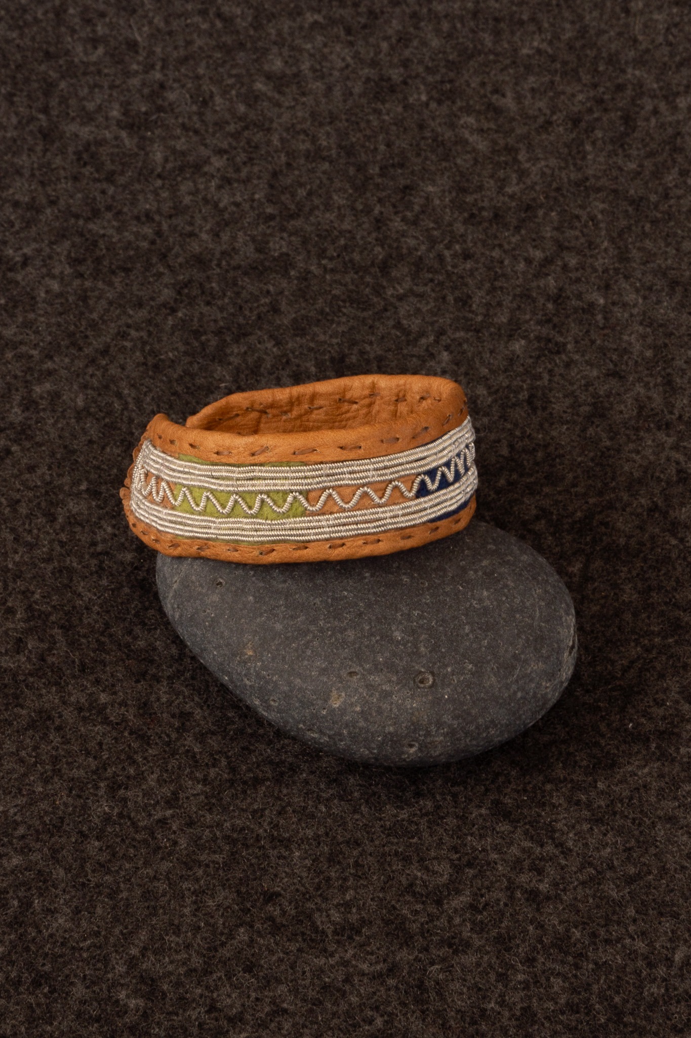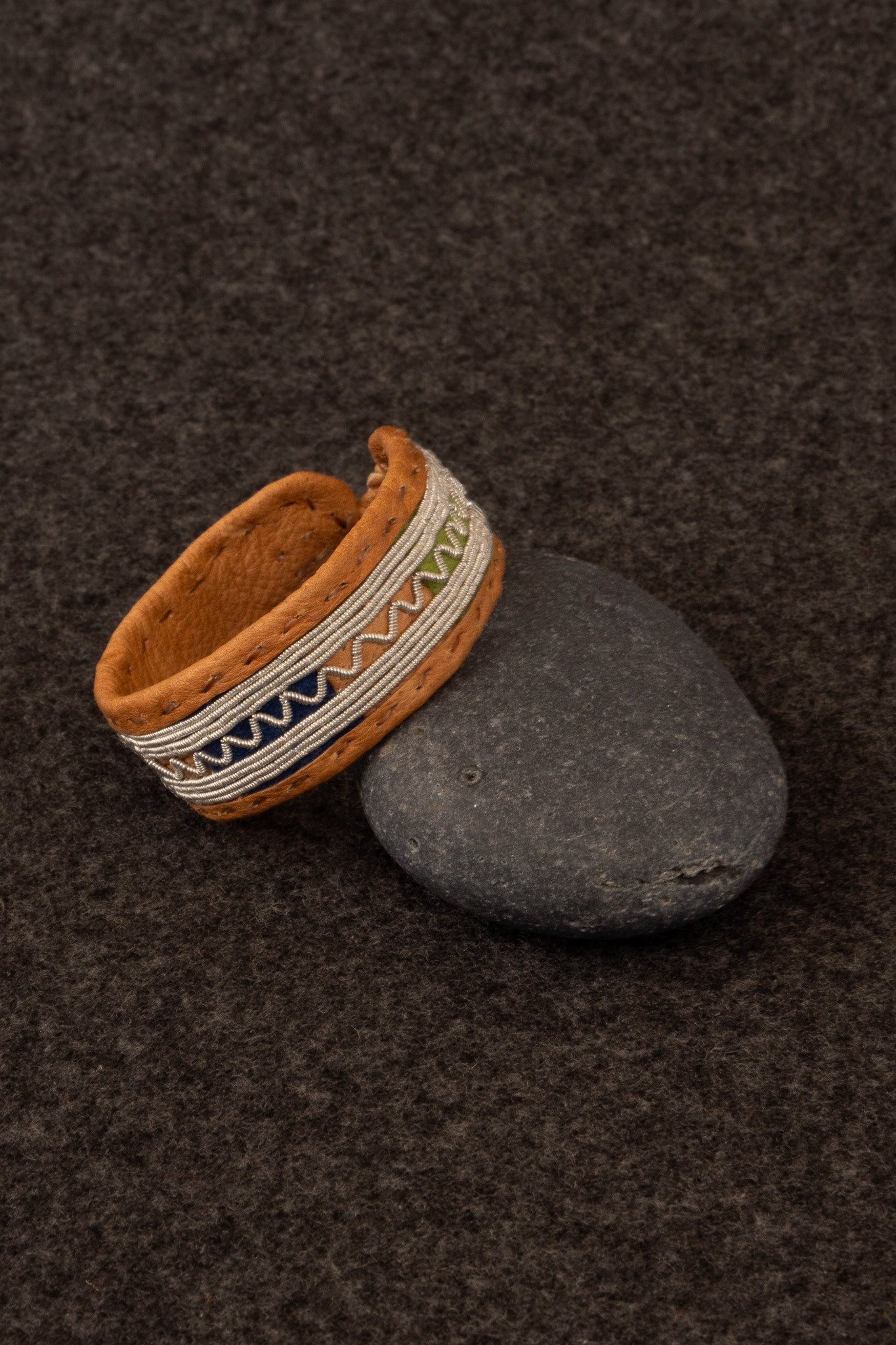 Tennbroderat armband med renskinn och fält av kläde i grönt, beige och blått, av Ann Skum Lindström.