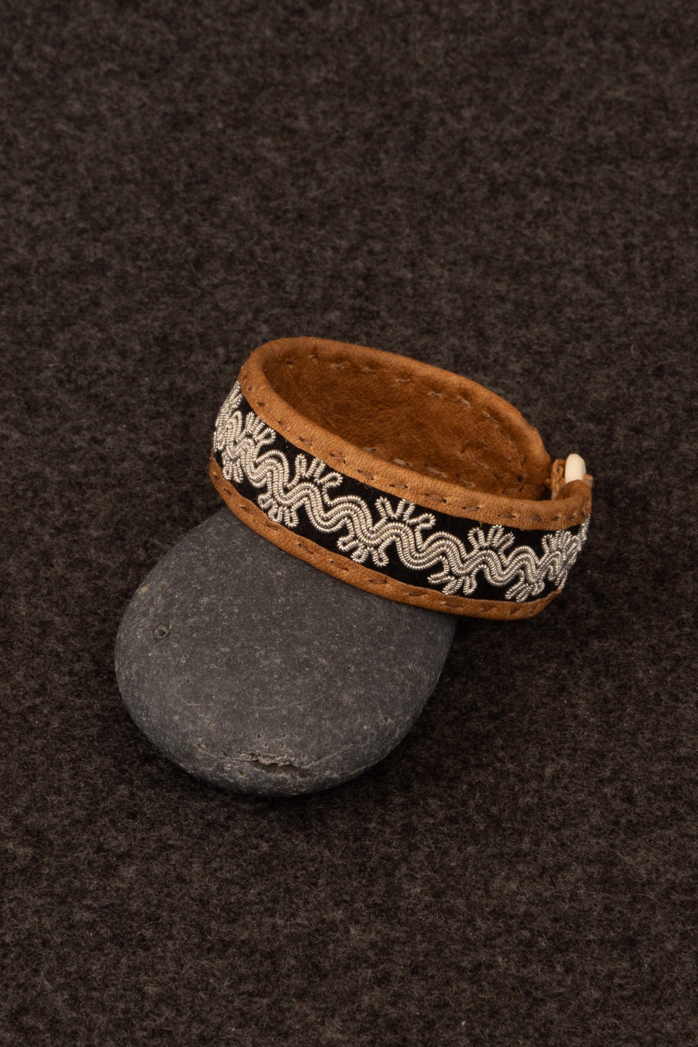 Tennbroderat armband med renskinn och svart kläde, av Ann Skum Lindström.
