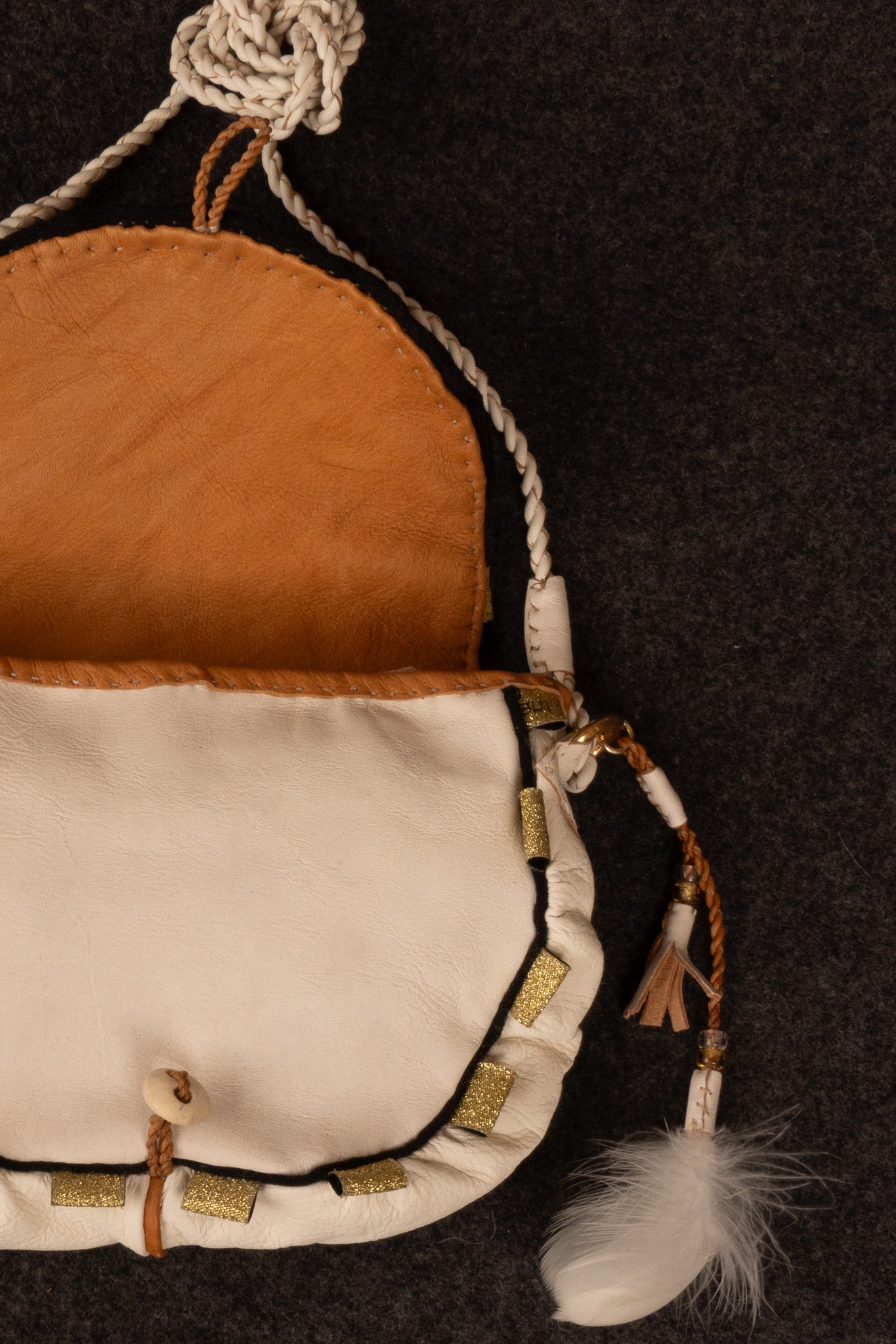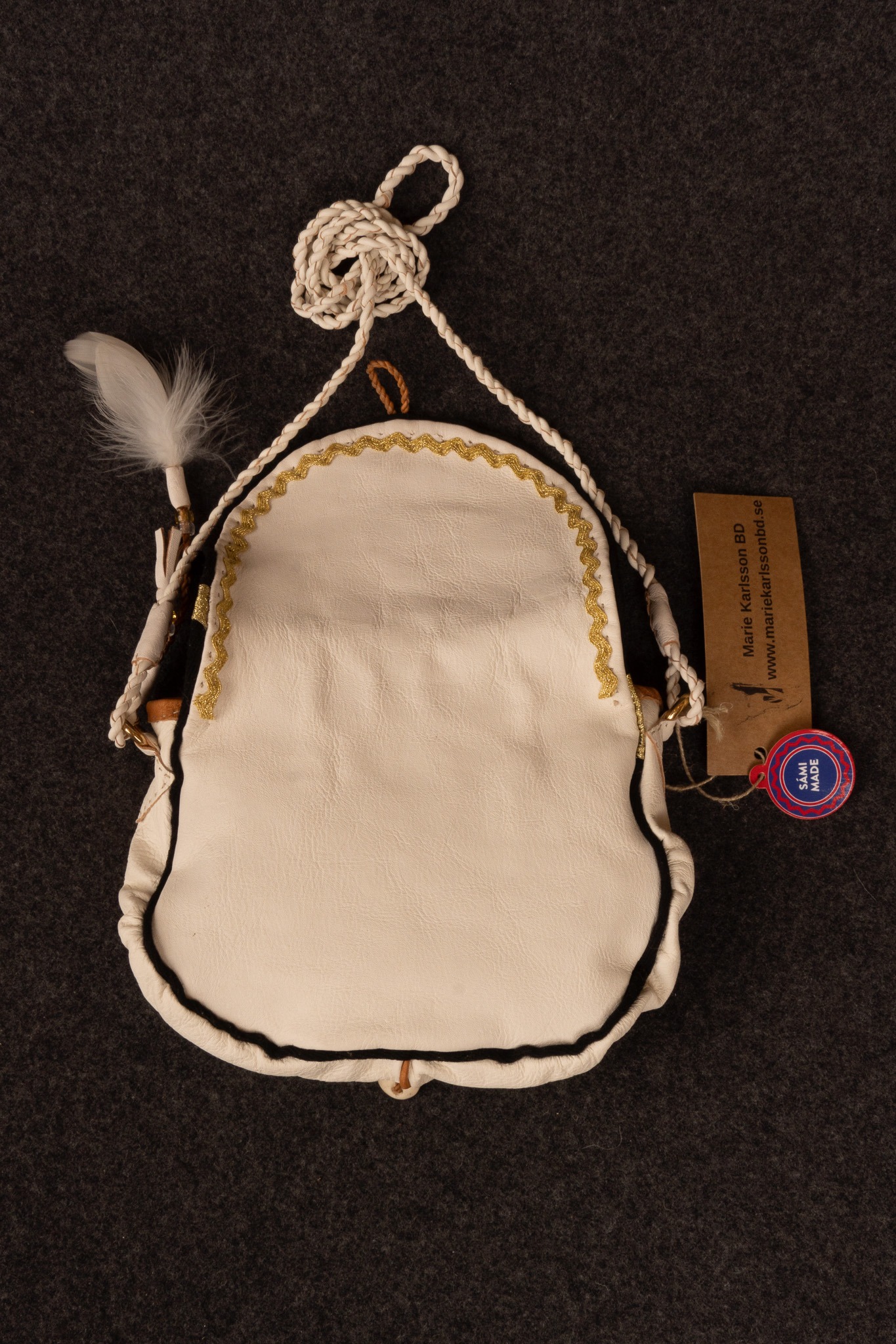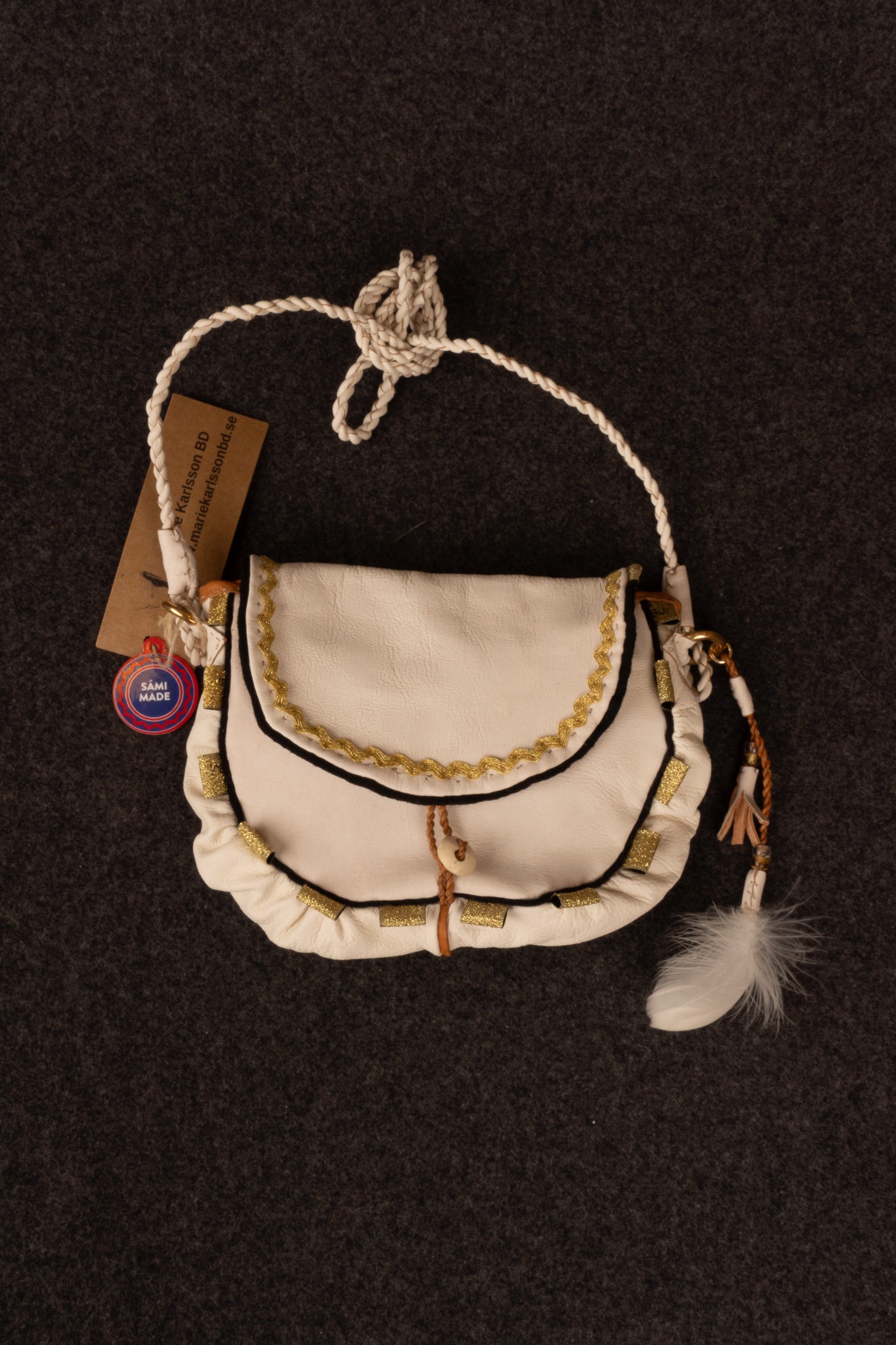 Väska i vitt naturgarvat renskinn med dekor i kläde, glitterband, mässingsringar, glaspärlor och fjädrar från Dalripa av Marie Karlsson.